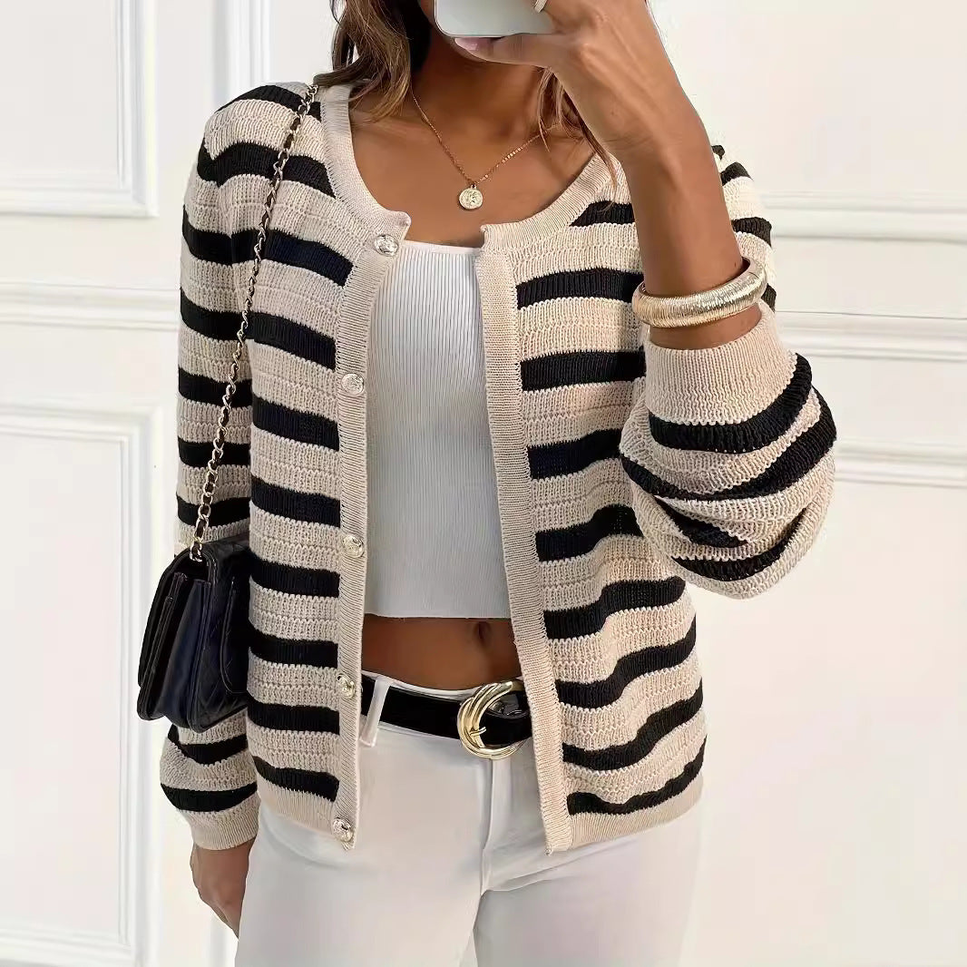 Lazy And Versatile Sweater Striped Knitted Button Round Neck Cardigan Casual Outerwear